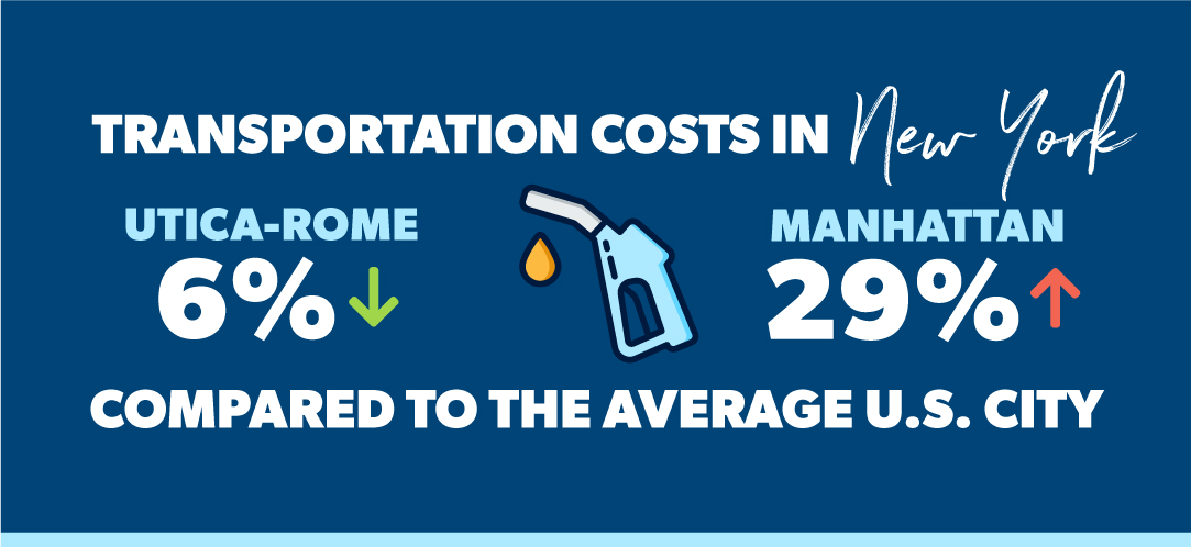 Rev up your engines—or fill up your MetroCard! New York transportation costs range from 6% lower than the national average in the eastern area of Utica-Rome, to 29% higher in Manhattan. Meanwhile, Rochester, birthplace of Kodak and Xerox, drifts into the middle range for transportation costs among most New York State cities, which is 5% higher than the national average.11
